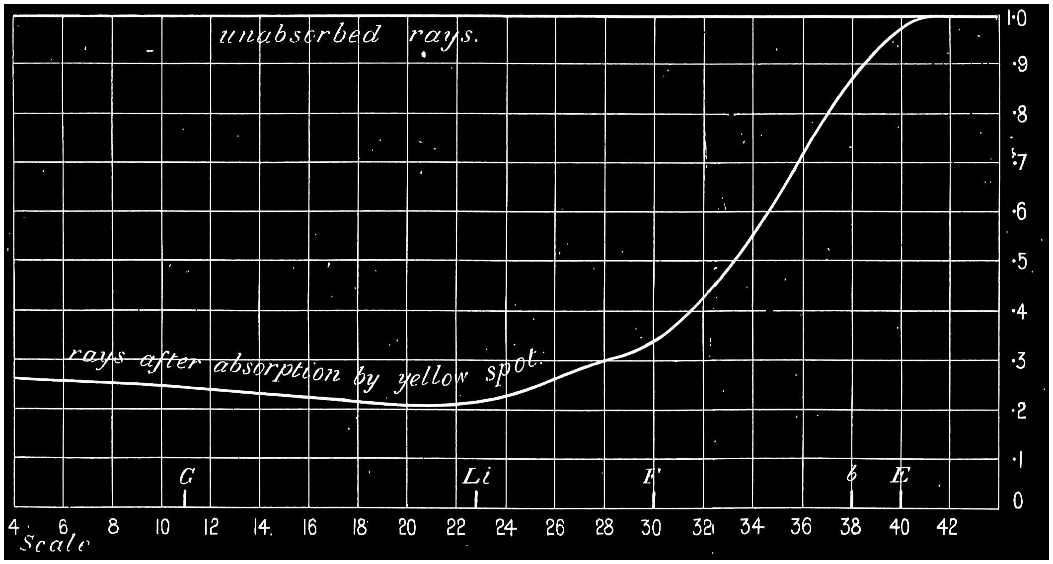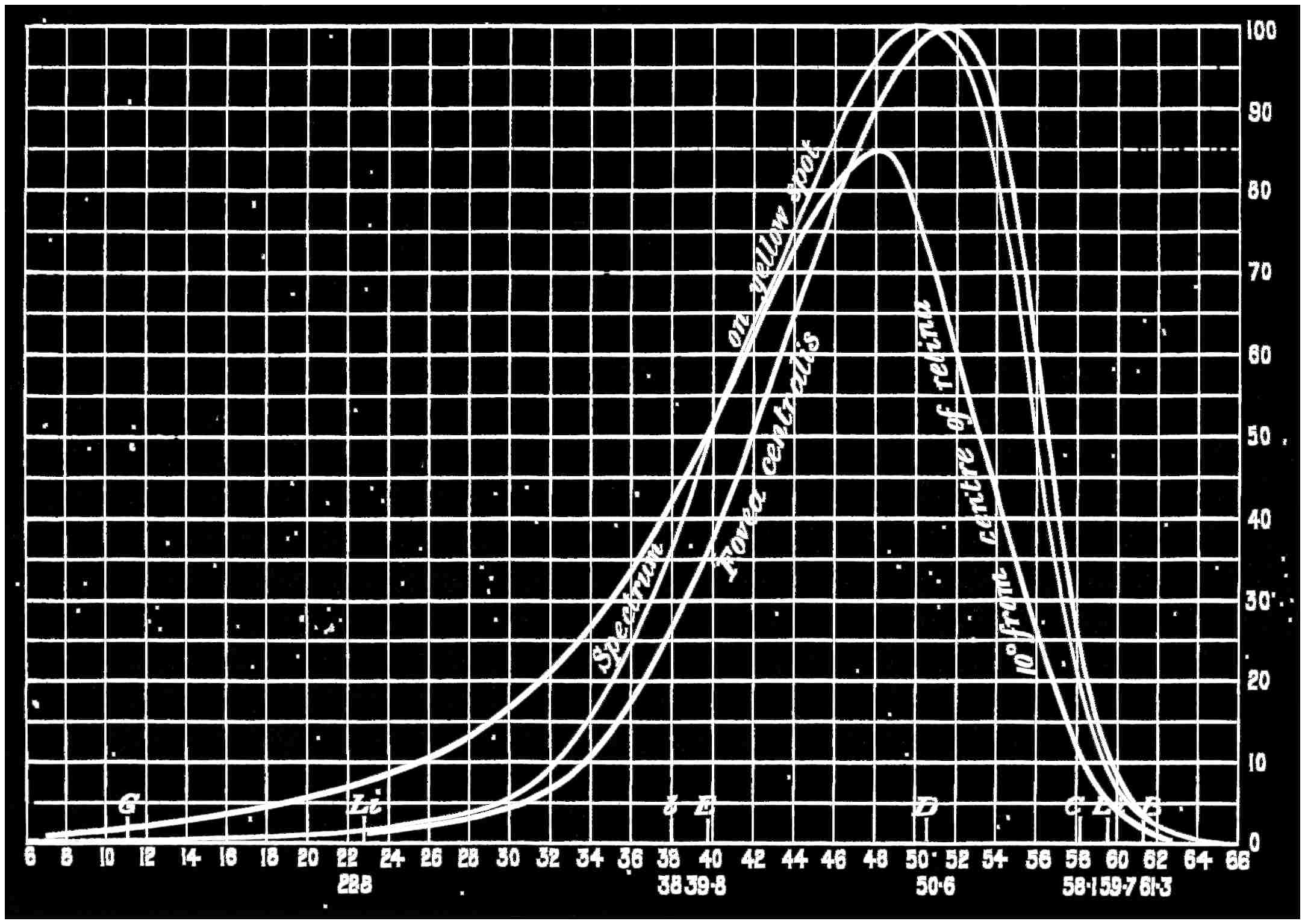 As far as the perception of colour is concerned, the principal part of the eye which is not distinctly optical—i.e. for the production of images—is the retina, and this it will be seen is in reality an outcrop of the brain, the connection between the two being the optic nerve. Owing to this connection, it is not easy to determine where the seat of colour perception is located; but for the purpose of physical investigation this is not of first-rate importance, nor does it affect the discussion of rival theories except in a minor degree. There are other subsidiary adjuncts in the eye to which, however, I must call attention, as they have a distinct bearing on the apparent intensity4 of some colours and of the hue that mixtures of others are perceived. The first is what is called the “macula lutea,” or yellow spot, a spot which it may be assumed exists in every eye. It is horizontally oval in form, and is situated in the very centre of the retina, embracing some 6° to 8° in angular measure. It has a brownish or yellowish tint, and the retina at this part is slightly depressed, being bounded by a slightly raised rim. In the centre of this area the retina becomes very thin, having a depression about 1/100 of an inch or ·3 millimetres in diameter, which is named the “fovea centralis,” where it is said that vision is the most acute. This statement can be well credited when we come to consider where the seat of the stimulation of sensation lies. The colour which tints the yellow spot is strongest at the crater-like rim, and fades away centrally and peripherally, and is said to be wholly absent in the fovea centralis.