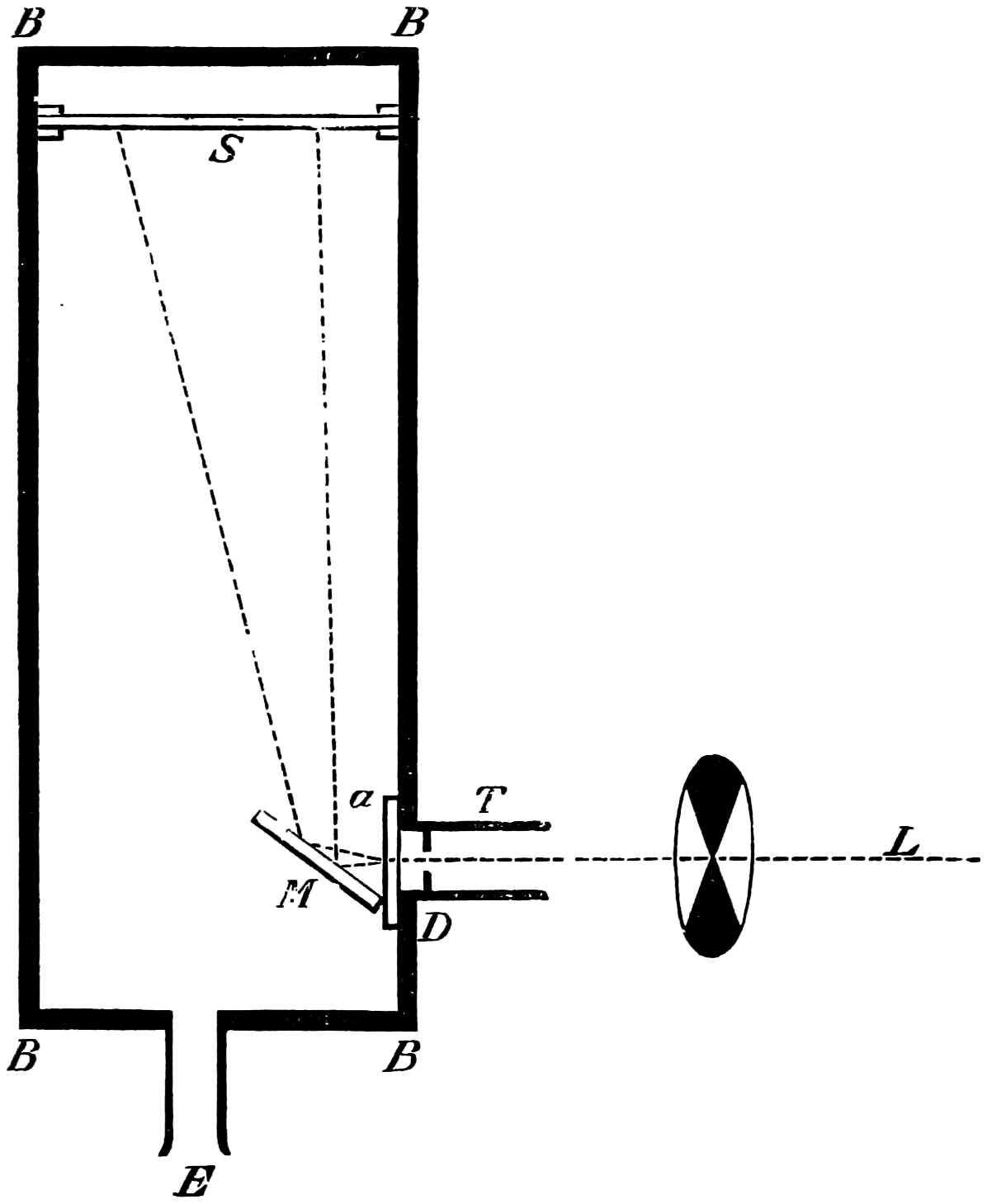 If it be required to measure the width of the slits S₂ (which we shall see further on is often necessary), a small lens of short focal length placed behind L₄ and near the slit will cast a magnified image on E, and by means of a scale placed there, the widths of each slit, if there are more than one, can be read off on the21 scale by bringing them successively into the same colour.