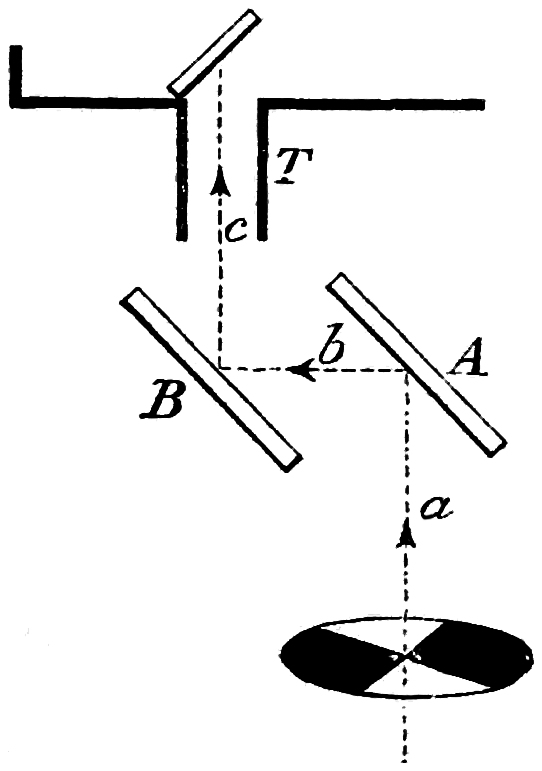Originally the comparison light was a candle, and it answered its purpose fairly well, and for obtaining absolute measures is convenient at the present time. Fig. 5 will show its arrangement, but as both the candle and the electric light may vary independently of each other, it will be seen that for merely the comparison of the different spectrum colours, the previous arrangement is the better. In both cases the two beams—the direct and the comparison—may be made to cast shadows22 by placing a rod in their path, the shadow cast by one light is then illuminated by the other light. By moving the rod towards or from the screen the shadows can be brought side by side.