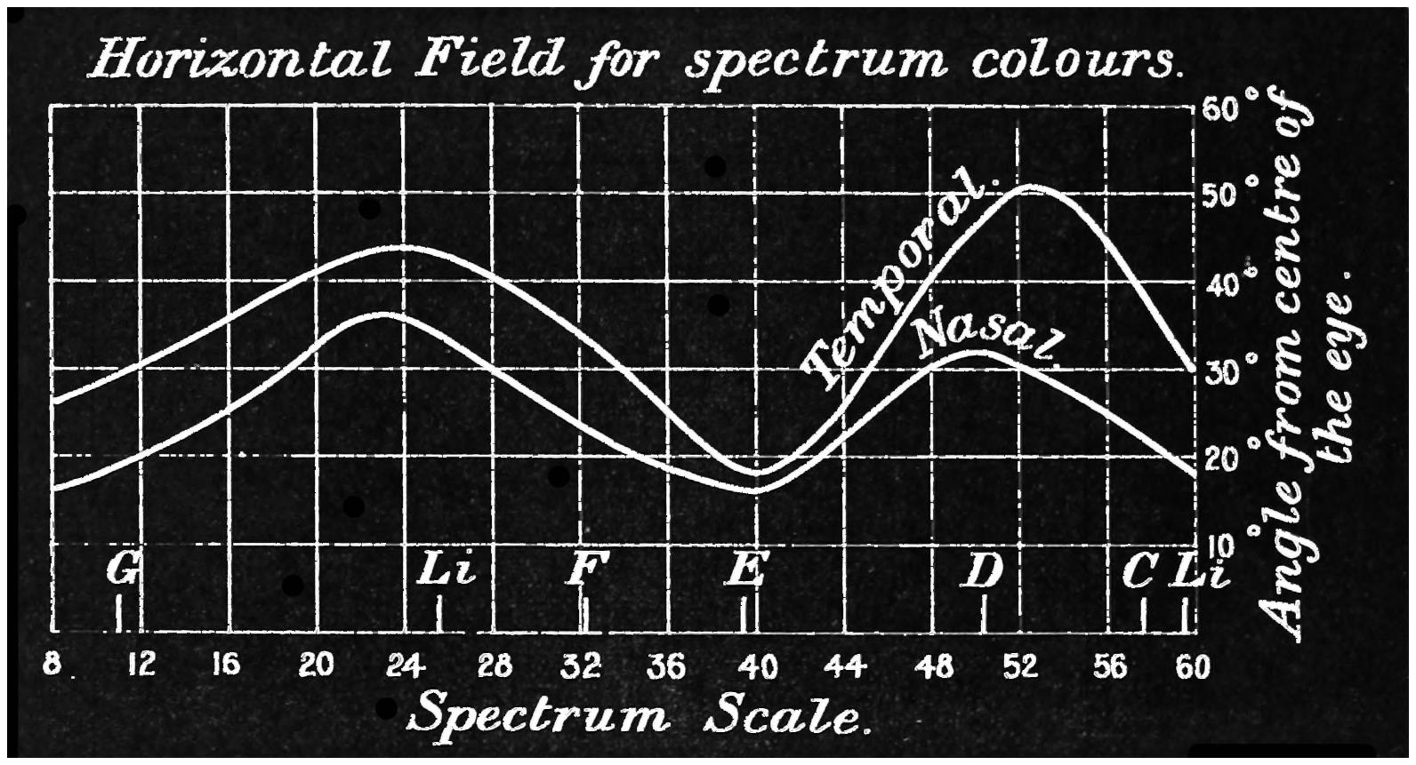 Many persons are not aware of the extent of the field of view which the eye embraces. Vertically it takes in about 100°, whilst horizontally it will take in some 145°, more or less. The field is smaller on the nasal than on the temporal side. When both eyes are used, the combined field of view is larger horizontally, being about 180°. The field of view which is common to both eyes is roughly a circle of about 90°. There11 is, however, a marked difference in the distinctness with which objects are perceived in the different parts of field of view. On the fovea centralis two dots placed so as to subtend an angle of 60″ will be perceived as double. That is to say, if a piece of paper, on which are two dots 1/30 of an inch apart, be placed 10 feet away from the observer, these dots will be seen as separated, whilst dots (in this case they should be black and of good dimensions) placed half-an-inch apart would still appear as one if viewed at the same distance near the periphery of the retina. In the yellow spot the distance apart of the cones is such that they subtend about the same angle as the dots when they are seen separate, viz., about 60″; that is, they are about 16/100000 of an inch apart, and hence may have something to say to the limit of separation. The field for the perception of colour is different to that for light.