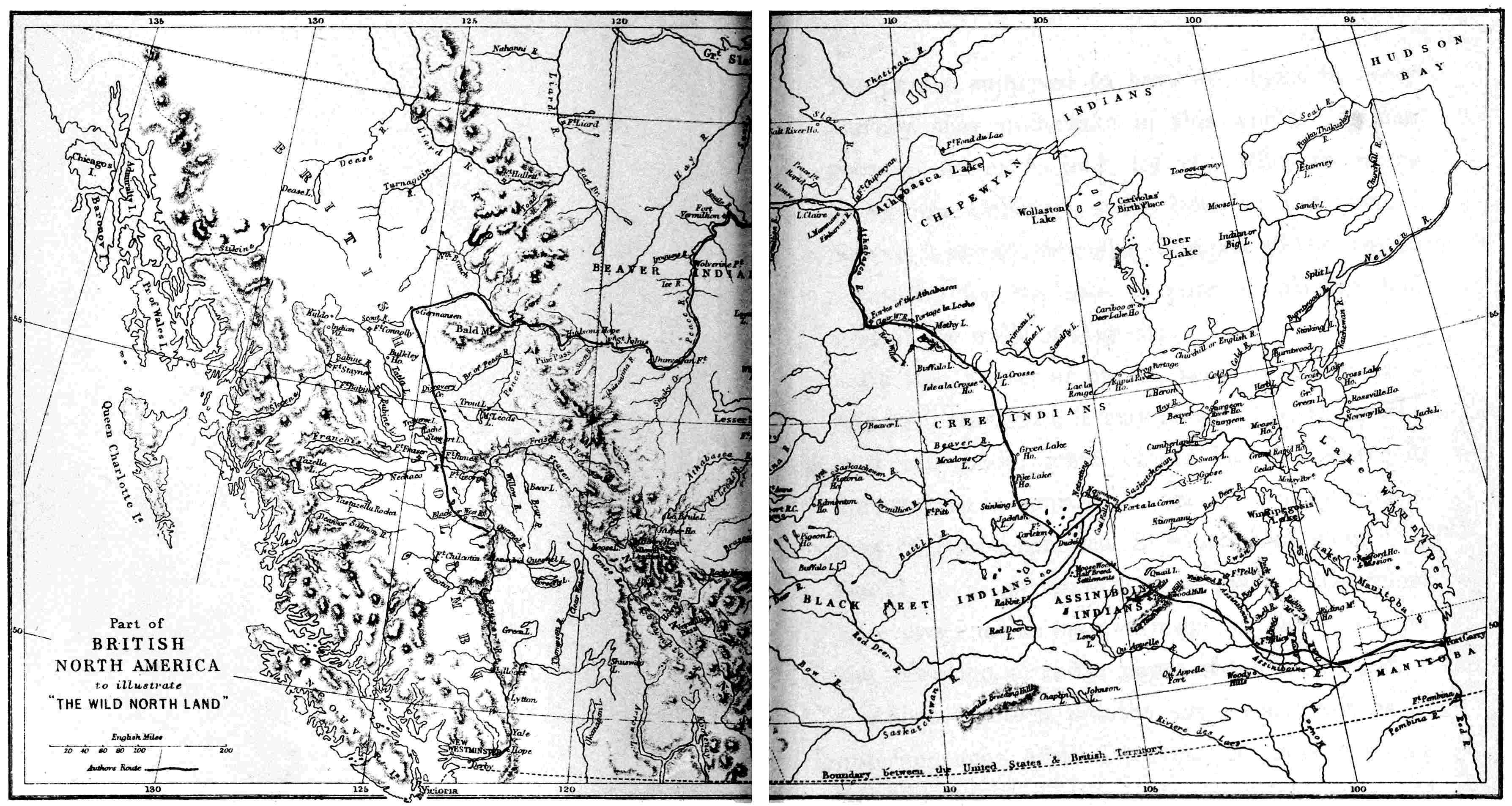 Many tracks lay before me in that immense region I call “The Wild North Land.” Former wandering had made me familiar with the methods of travel pursued in these countries by the Indian tribes, or far-scattered fur-hunters. Fortunate in recovering possession of an old and long-tried Esquimaux dog—the companion of earlier travel—I started in the autumn of 1872 from the Red River of the North, and, reaching Lake Athabasca, completed half my journey by the first week of March in the following year. From Athabasca I followed the many-windingvii channel of the frozen Peace River to its great cañon in the Rocky Mountains, and, journeying through this pass—for many reasons the most remarkable one in the whole range of the Rocky Mountains—reached the north of British Columbia in the end of May. From thence, following a trail of 350 miles through the dense forests of New Caledonia, I emerged on the 3rd of June at the frontier station of Quesnelle on the Frazer River, still 400 miles north of Victoria.