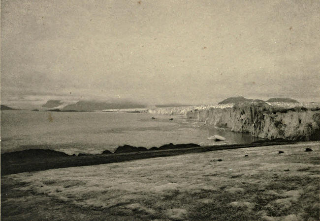 “On the morning of August 2, 1882, I set forth from the coast, in company with Lund and the ship’s boy, on an expedition up the little valley bordering the north side of Nordenskiöld Glacier. The bottom of this valley, with its small hills and little lakes, resembled some unwooded tract of Sweden.… Arrived at the head of the valley, we put on the rope and struck across the first side glacier. We had now reached the inland ice and were about 600 metres above sea-level. As there was no time for a long expedition over the ice, we decided to climb the mountain near at hand. The only plants found on its slope were some mosses and lichens. Of birds we only saw one fulmar petrel, which came flying over the inland ice. The top of the mountain was covered with old hard-packed snow. Its altitude according to the barometer was over 1200 metres above the sea. It is therefore, after Hornsunds Tind, the highest mountain hitherto measured in Spitsbergen, though there appear to be other mountains in its neighbourhood at least as high.