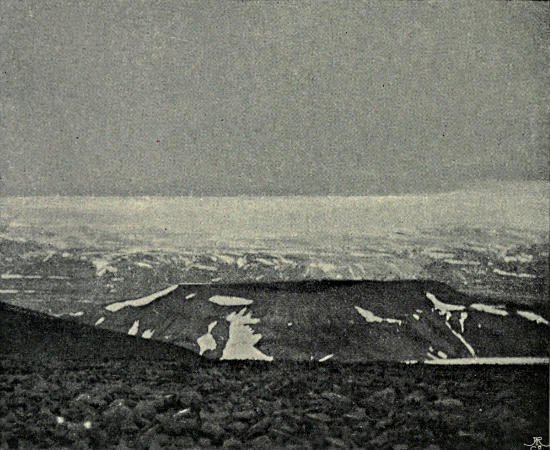 “The view from this point is perhaps the finest to be found on Spitsbergen. In the east, about sixty miles away, we saw a high mountain land with two peaks higher than the rest. [This was Wiches Land.] Between it and Spitsbergen lay a sea covered with great, continuous icefloes, obviously impenetrable by a ship.… In the north-east and north, far as the eye could reach, appeared the hills of North-East Land and Hinloopen Strait, with the strait itself and its islands apparently surrounded by water free of ice. Nordenskiöld recognised Mount Lovén, ascended by him in 1861.… The interior was likewise displayed before our eyes, a boundless immeasurable waste of snow, out of which here and there some mass of rock jutted forth,[46] dark in contrast with the blinding white surroundings. Only further away, west and north-west, were there any connected ranges of mountains. The whole west and north coasts of Wybe Jans Water were in sight, and the northern part of Barents Land, whose extreme point consists of a much crevassed snow-mountain ending steeply in the sea.”