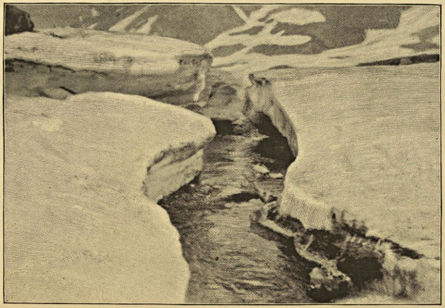“The shortest way back to the ship led down a rather steep ice-stream flowing between two hills from the place where we stood to the same broad, level glacier over which we had come in the ascent. The true source of the latter was, in fact, this ice-stream which flows down from the inland ice. We stood for a time at its edge, telescope in hand, discussing whether it would be[44] possible to descend by this apparently easy way, or whether we must go round by the longer route, somewhat dangerous as it was by reason of the hyperite cliff. A young “Balsfjording,” who carried our instruments, and had certainly climbed many a mountain near his home, but probably never been on a glacier, looked at us with wondering eyes when we asked him his opinion. His expression seemed to say, “How can any one be in doubt about so obvious a matter?” Without a word, he sprang down the ice-slope, theodolite in hand, to our great terror, for we feared that, as usual, the glacier would be broken by crevasses, and difficult to cross. Our anxiety did not last long before we saw him come to a halt, and just in time, for, on coming nearer, we found that a great schrund was immediately before him. We crept to its edge and looked down into the weird, bottomless depth, whose walls were azure-blue cliffs of ice, here and there covered with white icicles like stalactites. Lower down everything was lost in a dark-blue gloom. This crevasse stretched almost the whole way across the glacier, so that a long detour had to be made before it could be crossed. Later on we encountered a great number of such crevasses, some of which we turned, others jumped over, others again crossed by ice-bridges. Not till we reached the main stream of the glacier did the crevasses come to an end and the descent became quick and easy.”