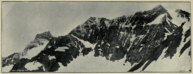 “We wandered first over the great moraine, which the glacier has cast down before itself, then climbed the gently sloping ice-field. This proved to be unexpectedly fatiguing and disagreeable work. The surface consisted of thawed and refrozen snow, covered with a crust of faggot-like formation, which frequently broke up under our tread, so that the foot sank into the soft snow beneath and was with difficulty withdrawn through the icecrust, whose sharp edges cut into the boots. The top of the mountain, hidden at first by the humps of the glacier, came into view after an hour’s ascent, but was still far away. We had several hours of work over snow of similar character before we reached the summit, a small plateau covered with powdery snow a foot deep upon hard ice.