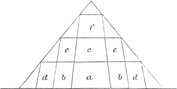 It will be seen that the horizontal, vertical, and diagonal rows give each the same sum, namely, 15.