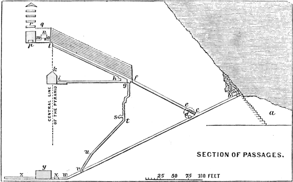 I scarcely need tell you that I did not descend what is called the well. It was explored by Mr. Davison, and afterwards in 1801 by Col. Coutelle; but its termination and use remained involved in uncertainty and mystery, until it was cleared out in 1817 by Caviglia. On the right of the lower end of the Grand Passage two feet below the floor, are three low steps occupying a space of four feet and a half in length. Beyond them is the mouth of the first shaft which is two feet two inches square. Here are little notches roughly cut in the sides in which to place the fingers and toes, and as the space is narrow, a person may descend without the aid of a rope, as my brother did, but he found it difficult and dangerous to do so. The ascent is attended with less danger, and seems precisely like climbing a chimney. At the depth of a few feet it becomes very rugged and irregular, and continues so for nearly fifty feet. After descending rather more than sixty feet, an aperture is seen on the southern side, which is the entrance of a kind of grotto (s) between five and six feet high, and about three times as long, turning to the right. It is hollowed out in a vein of coarse but compact gravel, and the well in consequence of this vein, is lined with masonry for the space of a few feet above and below the grotto. Where the masonry ceases (t) the well takes a sloping direction and continues so to the bottom; but towards the bottom (see u in the section) the slope becomes more steep. All the sloping part is cut through the solid rock below the foundation of the pyramid, and is of a square form. At the bottom of the well (v) is a horizontal passage six feet long, communicating with the first passage, two hundred and twelve feet below the aperture by which one ascends to the second passage.