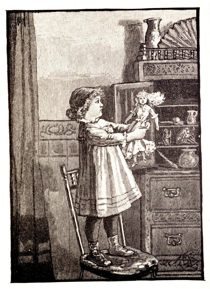 In the afternoon the child, having quarrelled with little Ethel, strayed alone into Mrs. Gray's chamber. There on the great bracket against the wall stood that wonderful inlaid cabinet, pretty enough in itself to be gazed at and examined by curious little folks, even if there had been nothing inside. Kittyleen knew, however, that it contained the doll—Flaxie's doll—that was too sacred for little girls to touch. She could not have told afterwards why she did it, but she climbed on a chair and pulled at one of the doors of the cabinet. She certainly did not expect it would open, but to her intense delight it did open, and there in plain sight on a shelf lay the beautiful princess, fast asleep.