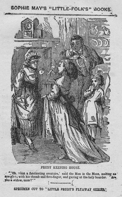 “Don’ know how; please tell us how,” said Flaxie, clutching Mrs. Prim by the skirt, and wishing there was a hinge in that lady somewhere, so she could bend.