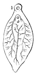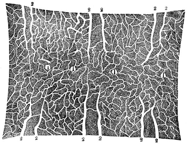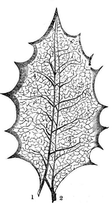 View of the net-work which forms the solid structure of the leaf, and which consists partly of woody fibres, and partly of spiral vessels. 1. Vessels of the upper surface; 2. vessels of the under surface; 3. distribution of the vessels through the substance of the leaf; 4. interspaces between the vessels occupied by parenchyma or cellular tissue.