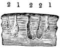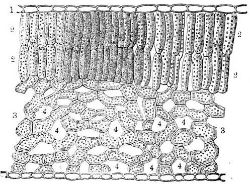 Vertical section of the leaf as it appears when seen highly magnified under the microscope. 1. Cells of the cuticle filled with air; 2. double series of cylindrical cells occupying the upper surface of the leaf filled with organic particles; 3. irregular cells forming a reticulated texture occupying the under surface of the leaf; 4. interspaces between the cells, termed the intercellular passages or air chambers.