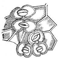 317. The cuticle consists of a layer of minute cellules, colourless, transparent, without vessels, without organic particles of any kind, and probably filled with air (fig. CXXIII. 1). These cel5lules open externally, at certain portions of the cuticle, by apertures or passages which constitute the stomates (fig. CXXIV.), and which present the appearance of areolæ with a slit in the centre (fig. CXXIV.). They form a kind of oval sphincters, which are capable of opening or shutting, according to circumstances, and they are disposed on both surfaces of the leaf, but most abundantly on the under surface, excepting in leaves which float on water, in which they are always on the upper surface only.