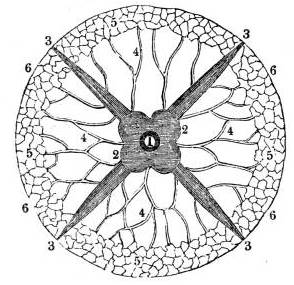 1. The mouth; 2. the stomach; 3. large canals going from the stomach; 4. smaller canals which form; 5. a plexus of vessels at the margin of the disc serving for respiration; 6. margin of the disc.