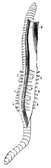 1. Respiratory tufts. 2. Artery and vein, supplying the respiratory apparatus. 3. Dorsal vessel.