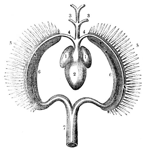 1. Auricle (Single) of the heart. 2. Ventricle (single) of the heart. 3. Trunk of the branchial artery. 4. Division of the branchial artery going to the branchiæ or gills. 5. Leaves of the branchiæ. 6. Branchial veins, which return the blood from the branchiæ, and unite to form. 7. the aorta, by the division of which the aërated blood is carried out to the system.