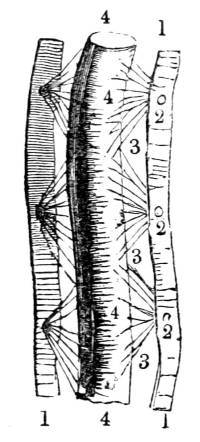 988. It is conjectured that the immediate living agents by which this vital attraction is exerted between the blood and the tissues are the organic nerves. These nerves consist of two sets, those which enter as constituents into the tissues and those which accompany the capillaries. It has been shown (304), that while the membranous446 tunics of the capillaries diminish, the nervous filaments distributed to them increase; that the smaller and thinner the capillaries the greater the proportionate quantity of their nervous matter; and that this is most remarkably the case in organs of the greatest irritability. It is conceived that the capillaries, in consequence of the nervous structure which thus envelops them, exert upon the fluid which is flowing through them an influence perfectly analogous to that of the secreting organ, in consequence of which similar particles are abstracted from the blood as those which compose the tissue in which the operation takes place.