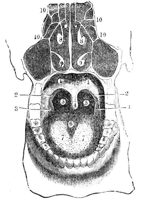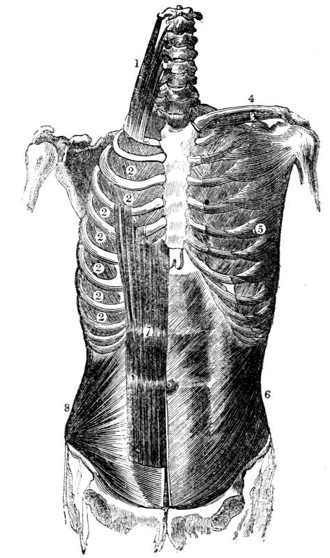 334. Whatever the medium breathed, the organic tissue which constitutes the essential part of the immediate organ of respiration is the skin. The primary tissue of which the skin is composed is the cellular (23 et seq.), which, organized into mucous membrane (33 et seq.), forms the essential constituent of the skin (34). In all animals the skin covers both the external and the internal surfaces of the body (34). When forming the external envelop, this organ commonly retains the name of skin; when forming the internal lining, it is generally called mucous membrane; and in all animals, from the monad to man, either in the form of an external envelop, or an internal lining, or by both in conjunction, or by some localization and modification of both, the skin constitutes the immediate organ of respiration. In different classes of animals it is variously arranged, assumes various forms, and is placed in various situations, according to the medium breathed, and the facility of bringing its entire surface into contact with the surrounding element; but in all, the organ and its office are the same: it is the modification only—that modification being invariably and strictly adaptation, which constitutes the whole diversity of the immediate organ of respiration.