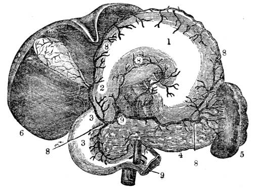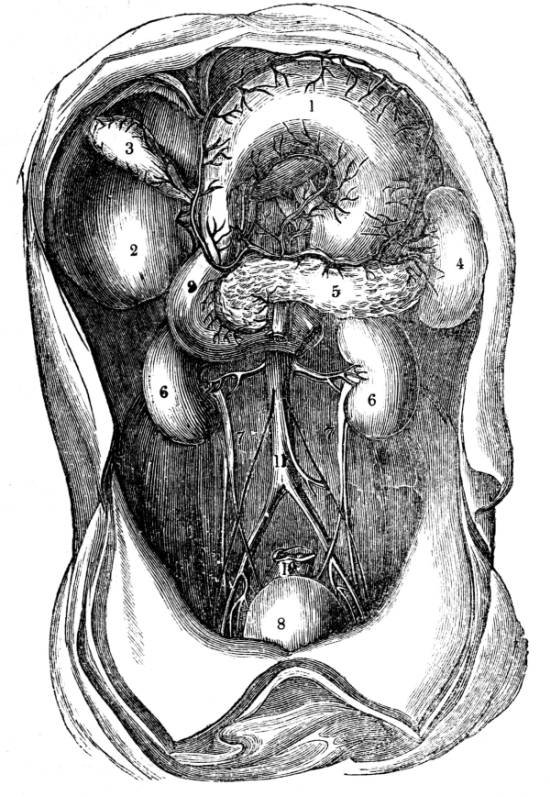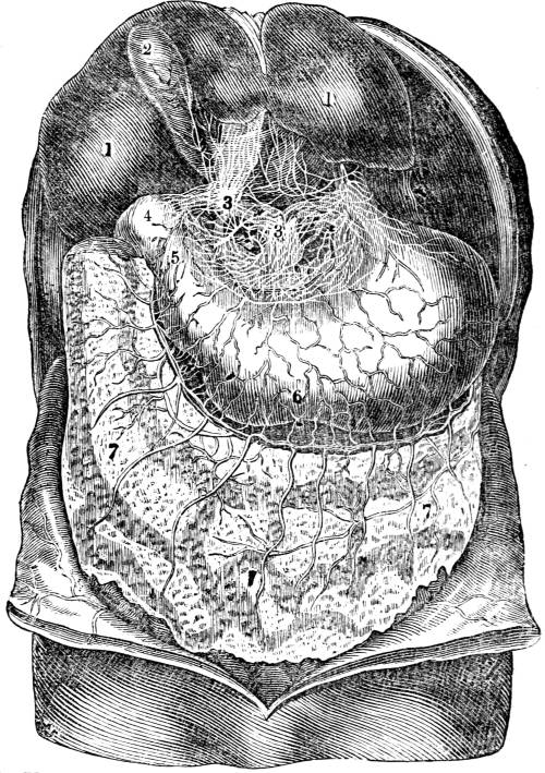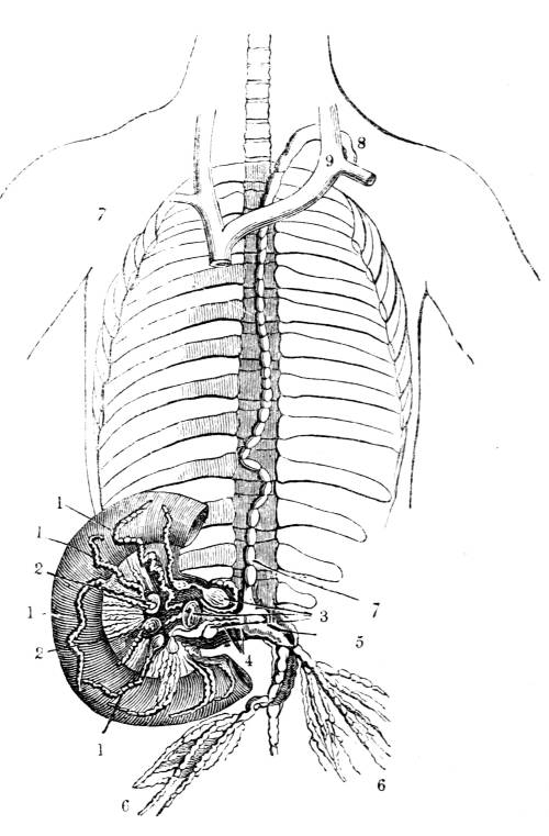 922. From the power of absorption possessed by the veins of the stomach and intestines, from the connexion proved to be established between409 the venous and absorbent systems, and from the discovery of Lippi, that several absorbent branches in the abdomen terminate directly in the pelvis of the kidney, that is now an established fact which was long a conjecture, that there exists a short route from the stomach to the kidneys, so that the extreme rapidity with which certain substances mixed with the aliment appear in the fluid secreted by the kidneys is no longer a matter of wonder.