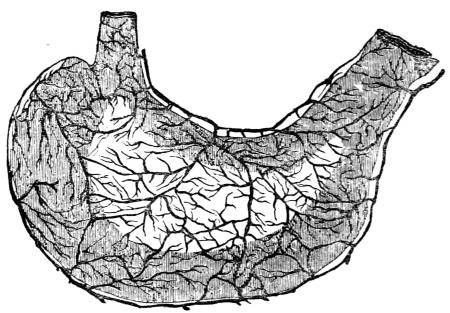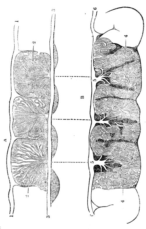 924. It has been shown that the mucous membrane which lines the alimentary canal is studded in its whole extent with glands, which secrete from the blood a large quantity of fluid,410 These secretions go on without interruption, whether food be taken or not, so that there may be copious alvine evacuations though not a particle of food enter the stomach; and the separation of the matter eliminated from the blood by this extended membrane can no more be dispensed with than that by the skin or the lungs. There is, too, a most intimate sympathy between the secretion of the membrane that lines the internal surface of the body and that carried on by its external covering; any disorder of the one immediately and powerfully disturbs the natural course of the other: hence the diarrhœa, so often produced by the application of cold to the external skin, and the diseases of the skin, so constantly connected with a disordered state of the mucous membrane of the intestines.
