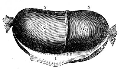 948. The liquor sanguinis contains in solution a large quantity of animal matter, fibrin (228), which separates spontaneously in a solid form on coagulation; the serum also contains a quantity of animal matter in solution, albumen (224), which424 does not separate in a solid form spontaneously, but only on the application of heat, acids, alcohol, &c. (224). The animal matter, the fibrin, which separates spontaneously from the liquor sanguinis in a solid form, constitutes one part of the clot, and the other part of it consists of the red particles which floated in the liquor sanguinis.