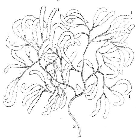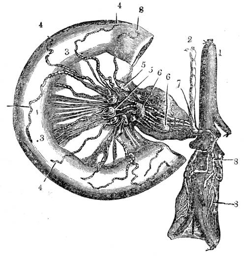 337. In creatures somewhat higher in the scale, a portion of the external surface is reflected inwards in the form of a sac, with an external opening (fig. CXXV. 1). In some medusæ there are numerous sacs of this kind, which pass inwards until they are separated only by thin septa from16 the cavities of the stomach. The water permeating and filling these sacs comes into contact with an interior portion of the body, not to be reached through the external surface. At the margin of the disk (fig. CXXV. 6) there is spread out a delicate net-work of vessels (fig. CXXV. 5); these vessels communicate with small canals (fig. CXXV. 4) which open into larger canals (fig. CXXV. 3) that proceed directly from the stomach (fig. CXXV. 2). As the aliment is prepared by the stomach, it is transmitted thence by these communicating canals to the exterior net-work of vessels where it is aërated.