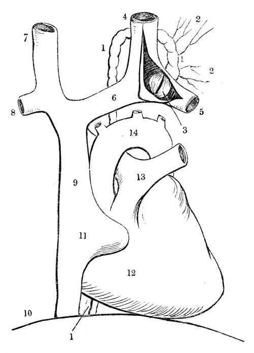 970. The commingled fluids, chyle and lymph,434 pass into the blood very slowly, drop by drop. The regulation of the rapidity of the admixture seems to be the chief office of the valve placed at the termination of the thoracic duct. When the operation is observed in a living animal, it is seen that this valve prevents the new matter from flowing into the blood in a full stream. If in a dog of ordinary size that has recently eaten as much animal food as it chose, the thoracic duct be opened in the neck, the dog being alive, there will flow from the duct about half an ounce of fluid in five minutes (831); yet when this fluid reaches the termination of the duct only a few inches further on, it flows into the vein only drop by drop, at considerable intervals. One great object of pouring the chyle and lymph into the venous system so close to the heart (fig. CLXXVIII.), and of causing the commingled fluid to pass under the action of that powerful engine before it is transmitted to the lungs, seems to be, by the agitation to which it is subjected in the right auricle and ventricle to accomplish the most perfect admixture possible between the particles of the chyle and lymph and the red particles of the venous blood; an object which would be counteracted by the too rapid entrance into the current of the circulation of the new and as yet imperfectly assimilated matter.