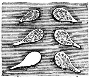 953. By carefully watching the development of the chick in the incubated egg, the first formation of the red particles can be distinctly seen. The blood in the new being, which is elaborated before the existence of the vessels that are to contain it, is formed from the substance of the germ or from that of the germinal membrane, and is augmented by the blood of the egg, which is the substance of the yolk. First, a number of granules are produced from the substance of the yolk. These subsequently lose their granular appearance, and become translucent. On the translucent ring is produced the nucleus of the blood corpuscles. When completely formed, the blood corpuscles of the bird, as of all the animals below the bird in the scale of organization,428 are of an elliptical figure, and quite flat (fig. CXII. 4, 5); but when first produced they are rounded globules, not flat, and they gradually assume their proper and permanent form; it is only on the sixth day of incubation that they begin to be elliptical, by the ninth day they are all elliptical (fig. CXII. 4, 5).