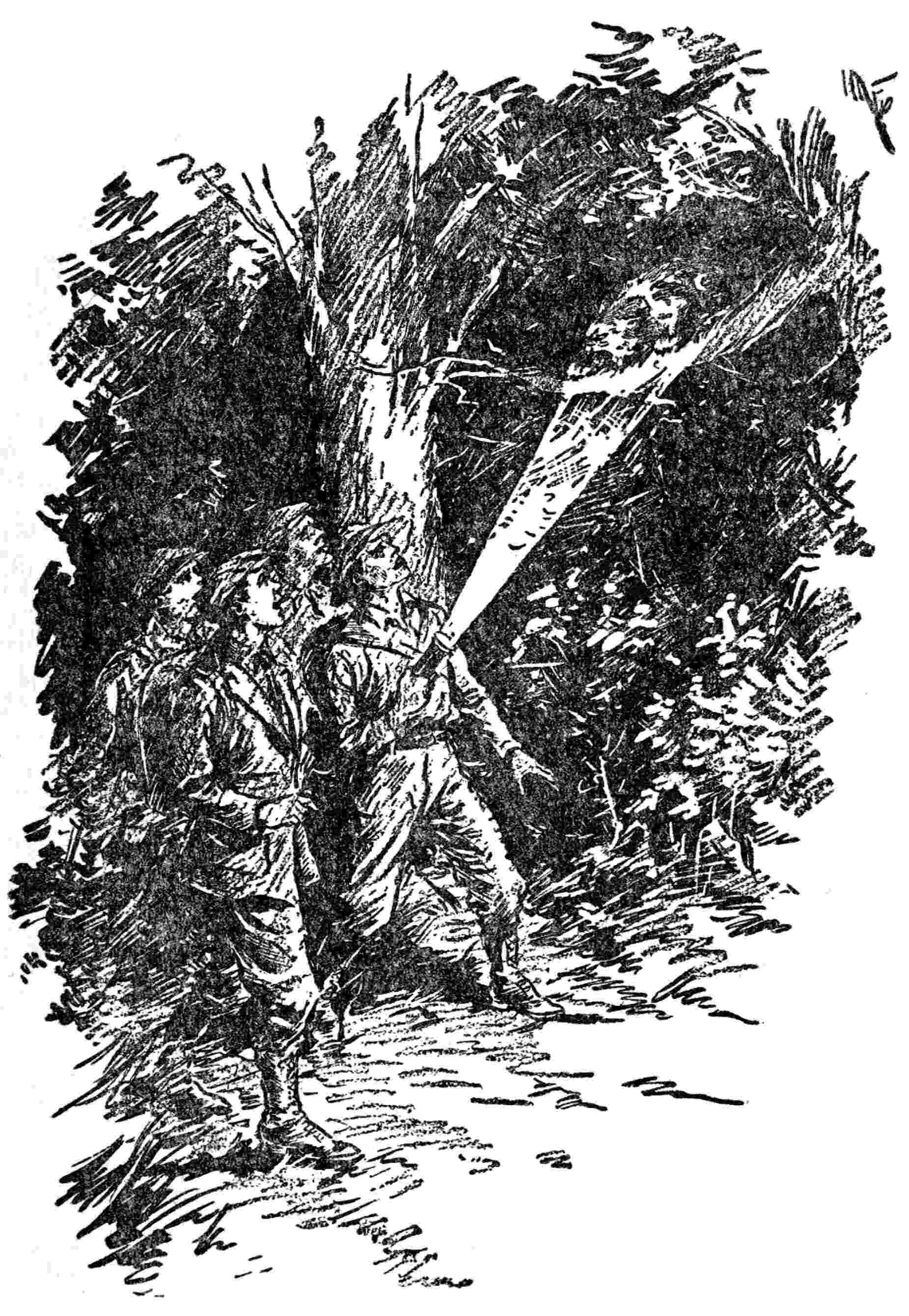 No one made any objection, and so the march was resumed. It might have been noticed, however, that Perk made it a point not to lag behind. He was continually imagining he saw crouching figures on many a low hanging limb when Elmer’s light moved this way and that.