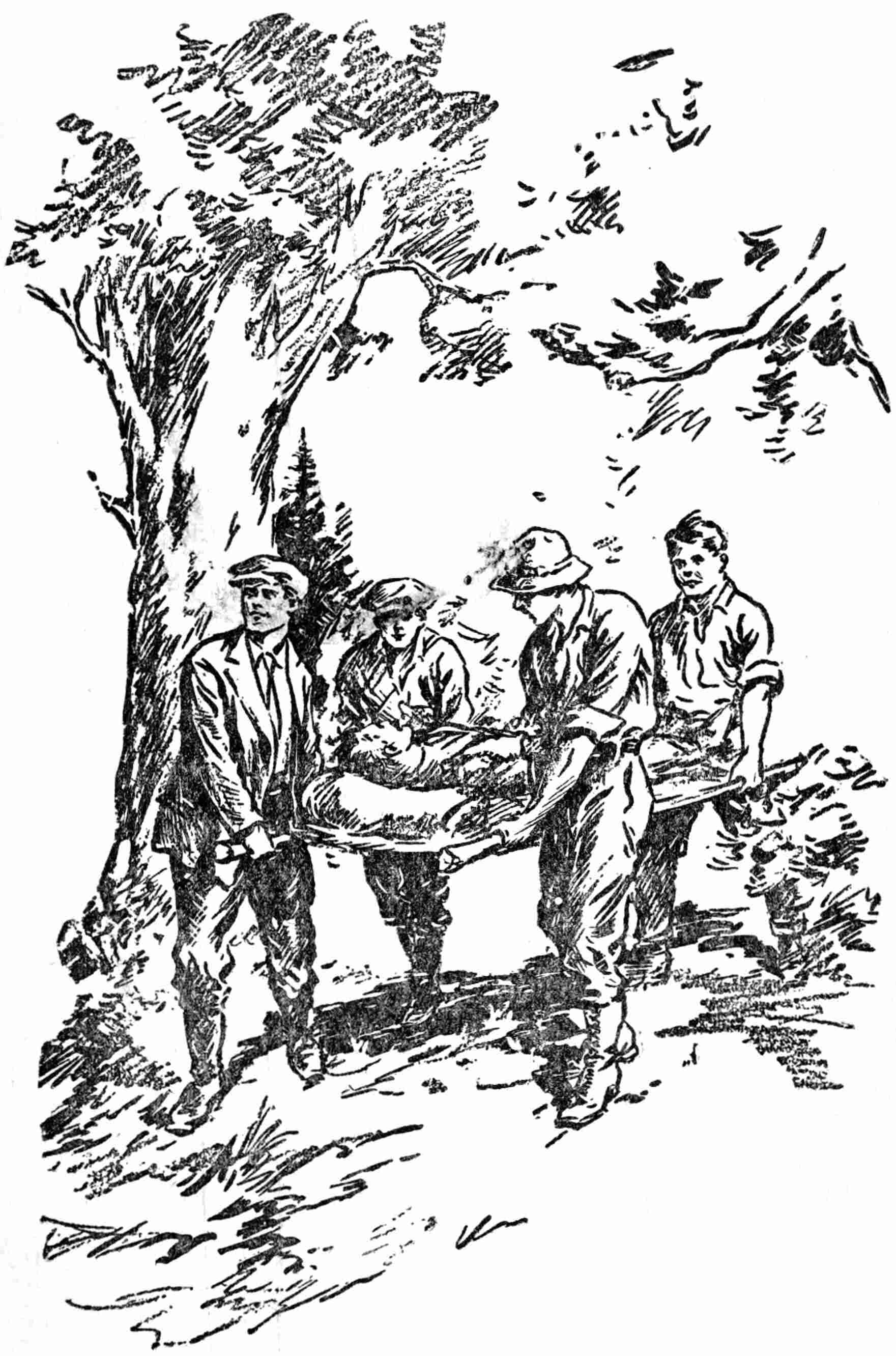 “Now, if you’ll help, Elmer,” he observed, “we’ll rig up a stretcher good enough for an emergency; though later on I’ll promise to better it in every way.”