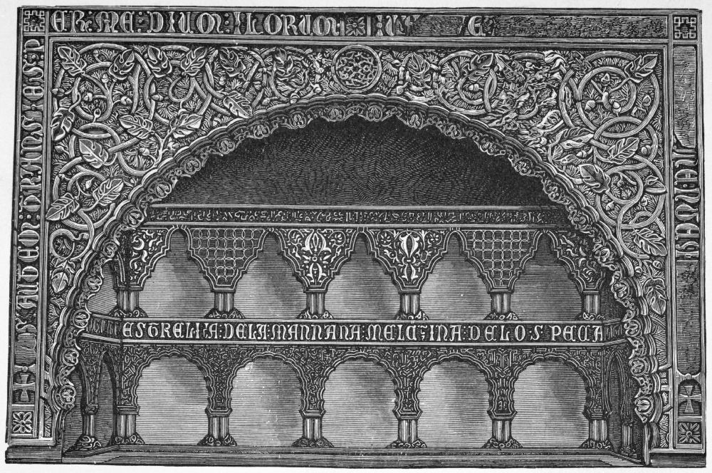 [26] The Alhambra was begun in the thirteenth century and completed in the fourteenth. Washington Irving, who visited it in 1829, in company with Prince Dolgorouki, has given an interesting account of his life there, which combines the romance and the history of the place.