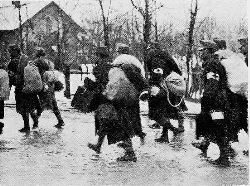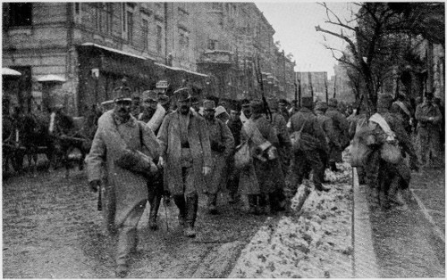 The spring is late here as it is throughout Russia this year, and it was snowing heavily as our big touring car, with a soldier as chauffeur, threaded its way in the early morning through the narrow streets of Lwow and out into the open country which was now almost white. Before we have been twenty minutes on the road we begin to pass occasional groups of dismal wretches in the blue uniform which before this war was wont to typify the might of the Hapsburgs, but which now in Galicia is the symbol of dejection and defeat. Through the falling snow they plod in little parties of from three to a dozen; evidently the rear guard of the column that went through yesterday, for they are absolutely without guards, and are no doubt simply dragging on after their regiments.