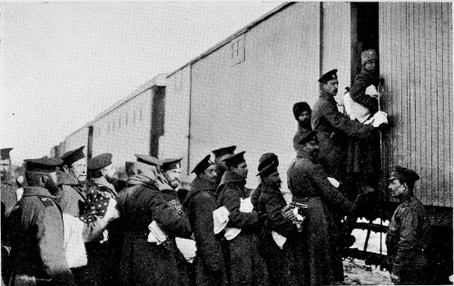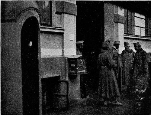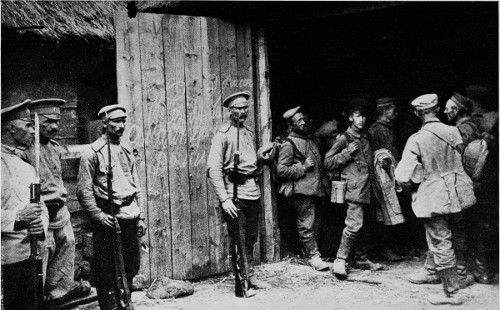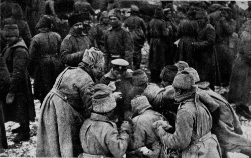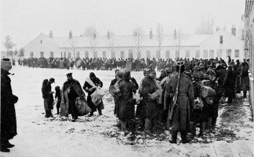 From Lwow almost due west runs the line of the highway to Grodek where we get our first 15 glimpse of prisoners in bulk. Here, at the scene of some of the fiercest fighting that the war has produced, is a rest station for the columns that are making the journey to Russian captivity on foot from Przemysl to Lwow, and I know not how far beyond. As we motor into the town the three battalions of the 9th Hungarian regiment of the 54th Landsturm brigade are just straggling into the town from the west. With a few Russians who seem to be acting as guides and nurses rather than as guards, they file through the streets and into a great square of a barracks. Here they are marshalled in columns of four, and marched past the door of the barracks where an official counts the individual fours and makes a note of the number that have passed his station. Beyond in a grove the ranks are broken, and the weary-looking men drop down under the trees, regardless of the snow and mud, and shift their burdens and gnaw at the hunks of bread and other provisions furnished them by the Russians.