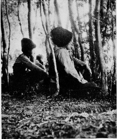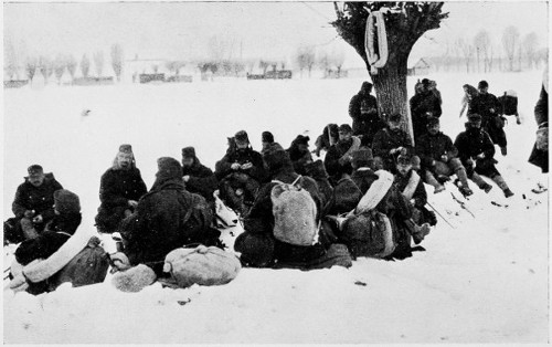 Just east of Sadowa Wisznia, the scene of another Austrian stand, we come upon a regiment 17 attached to the 54th Landsturm brigade. This is the tenth regiment, and, with the exception of a few non-commissioned officers, is composed entirely of Slovaks and Hungarians. They are resting as we motor up, and for nearly a mile they are sitting dejectedly by the side of the road, some with heads resting wearily against tree trunks, while dozens of others are lying in the snow and mud apparently asleep. As nearly as I could estimate, there is about one Russian to a hundred prisoners. In any case one has to look about sharply to see the guards at all. It reminds one a bit of trying to pick a queen bee out of a swarm of workers. Usually one discovers the guard sitting with a group of prisoners, talking genially, his rifle leaning against the trunk of a tree near by.