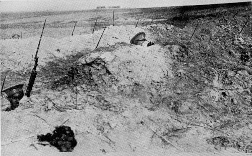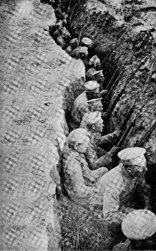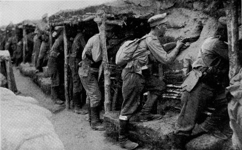 I could clearly see the back of our own trenches with the soldiers moving about in them. In the near foreground almost at our feet was one of our own batteries carefully tucked away in a little dip in the ground, and beautifully masked from the observing eye of the aeroplanist. To the south lay the line of the Austrian trenches, and behind that a bit of wood in which, according to the General who accompanied us, the Austrians had a light battery hidden away. Still further off behind some buildings was the position of the Austrian big guns, and the artillery officer in command of the brigade, whose observation point was here, told me that there were two 12-inch guns at this point, though they had not yet come into action.