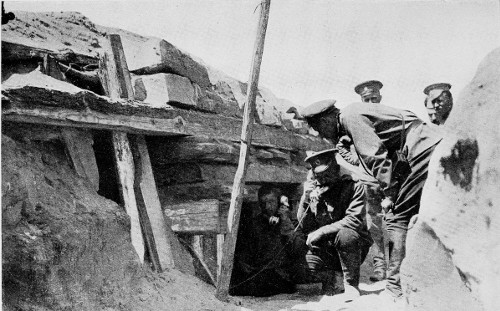 The General at once agreed to let me visit some observation point where I could have a glimpse of his positions and the general nature of the terrain. On his large scale map we found a point that towered more than 200 metres above the surrounding country, and he advised me to go there. So on the following day we motored to a certain army head-quarters, where the General in command gave us one of his staff, who spoke English, and an extra motor, and sent us on our way to a division then holding one of the front line trenches. Here by a circuitous route, to avoid shell fire, we proceeded to the observation point in question. It was one 295 of the most beautifully arranged that I have ever visited, with approaches cut in through the back, and into trenches and bomb-proofs on the outside of the hill where were erected the hyperscopes for the artillery officers to study the terrain.