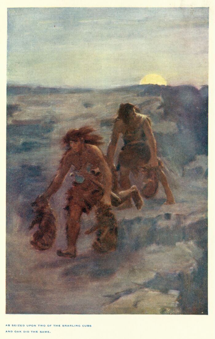 As twilight came on the woods rang with the shouts and laughter of a party of young men who were coming home from some forest trip. Ab, looking down the valley, over the flashing flame, into the forest hills, in whose deep shade lay Little Mok, old Hilltop and Ab's mother, could see the lusty youths in the village, running, leaping, wrestling and throwing spears, axes and stones in competition. A strange oppression came upon him and he thought of Oak lying in the ground alone on the hillside, miles away. Ab felt, even now, the strong, helpful arm of his friend around him, just as it was in the evening journey from the Feast of the Mammoth homeward, when he had been rescued from almost certain death by Oak. A lump rose in the throat of the man of many battles and many trials. He shook himself, as if to shake off the memory that plagued him. Oak came not often to trouble Ab's peace now, and when he came it was always at night. Morning never found him near the Fire Village.