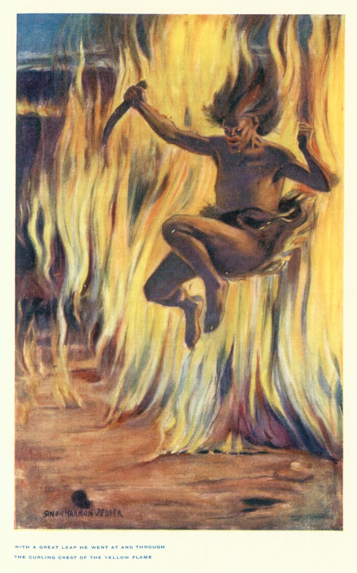 Not a moment too soon had that shrill cry reached the ears of the fighting man. He ran backward, shouting to a score of his people to follow him as he ran, and in an instant recognized that he had been outwitted, at least for the moment, by the vengeful Boarface. As he rushed to the east toward the wall of flame he saw a dark form pass through its crest in a flying leap. There were others he knew would follow. His own feat of long ago was being repeated by Boarface and his chosen group of best men!