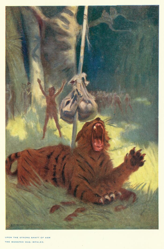 With every nerve strained, but with his first impulse of something like terror gone, Ab watched the devourer beneath him while his sharp flint knife, hard gripped, bore lightly against the taut rhinoceros-hide rope. The tiger began his ghastly meal but was not quite beneath the suspended spear. Then came some distant sound in the forest and he raised his head and shifted his position.