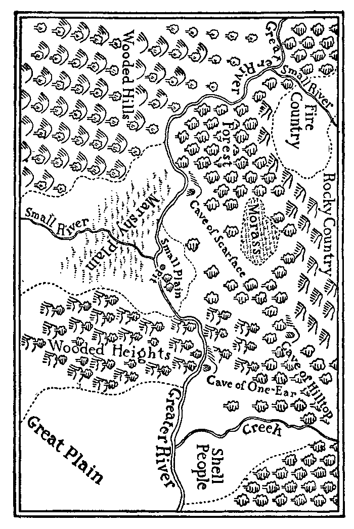 It is well to speak here of the river. The stream has been already mentioned as flowing to the eastward. It did not flow in that direction regularly; its course was twisted and diverted, and there were bays and inlets and rapids between precipices, and islands and wooded peninsulas, and then the river merged into a lake of miles in extent, the waters converging into the river again. So it was that the banks in one place might form a height and in another merge evenly into a densely wooded forest or a wide plain. It was so, too, that these conditions might exist opposite each other. Thus the woodland might face the plain, or the precipice some vast extending marsh.
