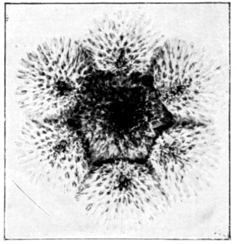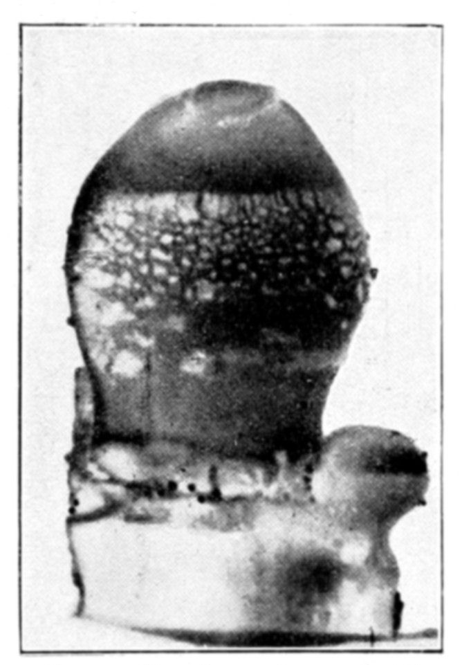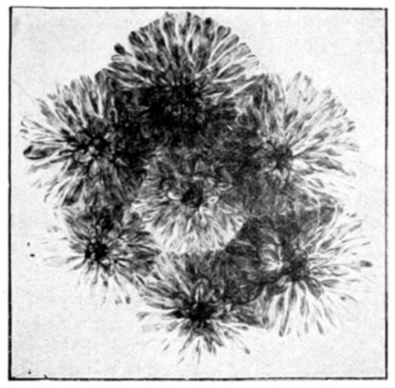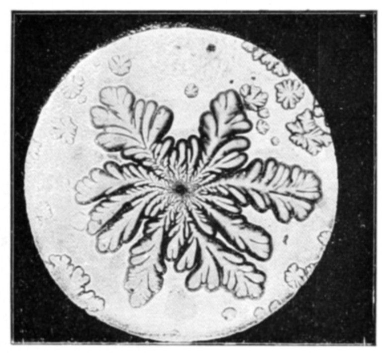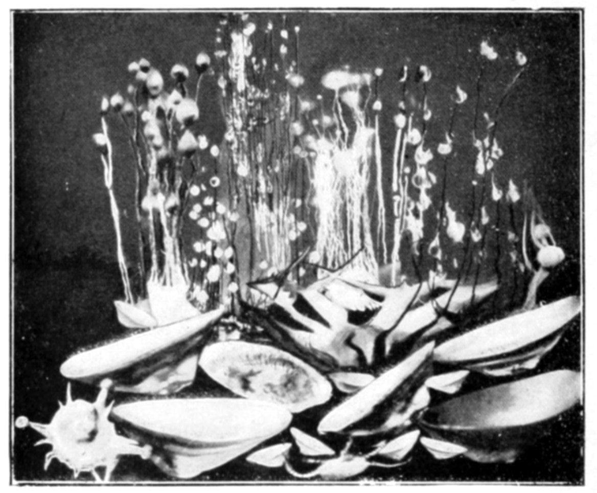 In conclusion we may say that osmotic growths are formed of an ensemble of closed cavities of various forms, containing liquids and separated by osmotic membranes, constituting veritable tissues. This structure offers the closest {144}resemblance to that of living organisms. Is it possible to doubt that the simple conditions which produce an osmotic growth have frequently been realized during the past ages of the earth? What part has osmotic growth played in the evolution of living forms, and what traces of its action may we hope to find to-day? Osmotic growth gives us fibrous silicates, phosphatic nodules, corals, and madrepores; it also gives us formations which remind one of the "atolls," calcareous growths rising like a crown out of the water. The geologist may well consider what rôle osmotic growth may have played in the formation of the various rocks, siliceous, calcareous, barytic, magnesian, the fibrous and nodular rocks and atolls. The palæontologist relies on the different forms found in his rocks to classify his specimens; from the existence of a shell, he concludes the presence of life. Since, however, forms which are apparently organic may be merely the product of osmotic growth, it is evident that he must reconsider his conclusions. The same may be said of the various forms of coral or of fungoid growths. In the {146}presence of a calcified or silicated fungus we can no longer argue with certainty as to the existence of life, without taking into consideration the possibility that the specimen in question may be an osmotic production.