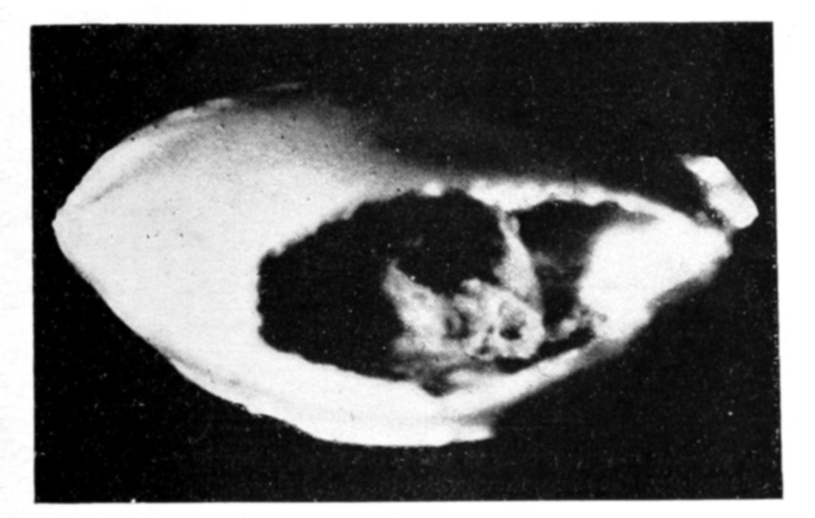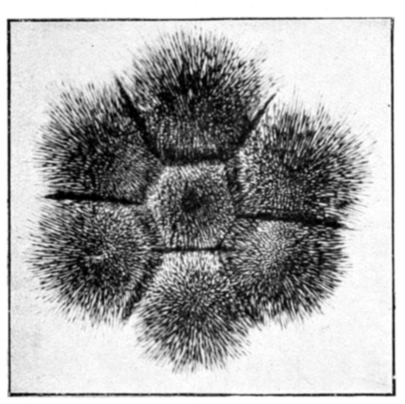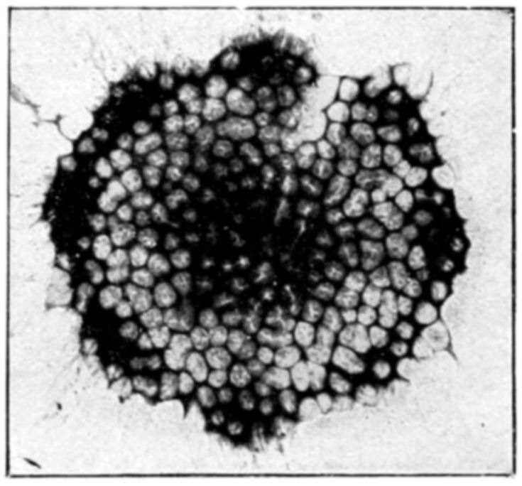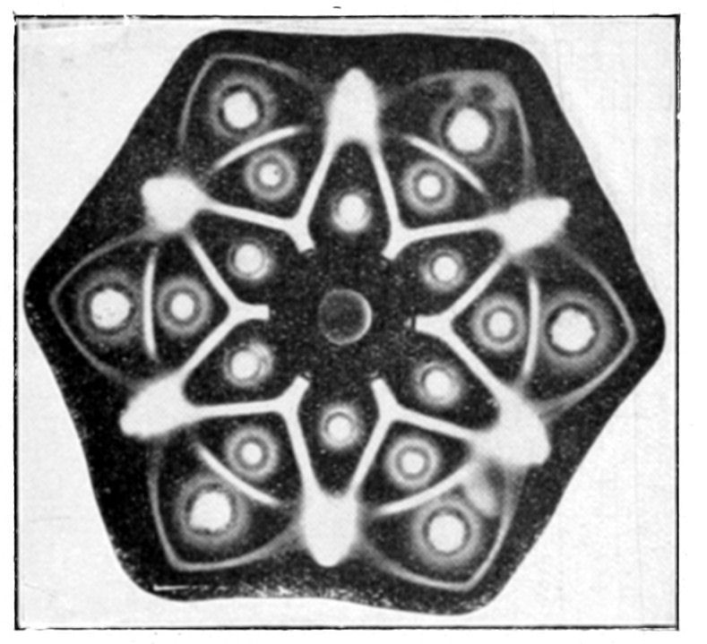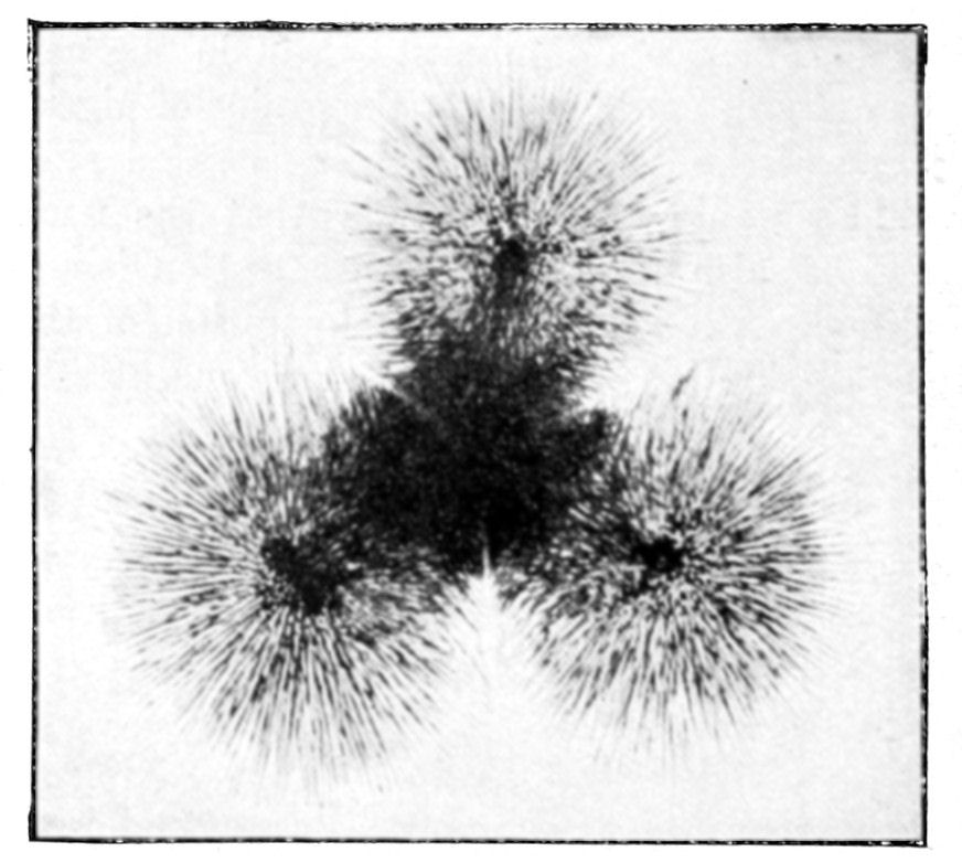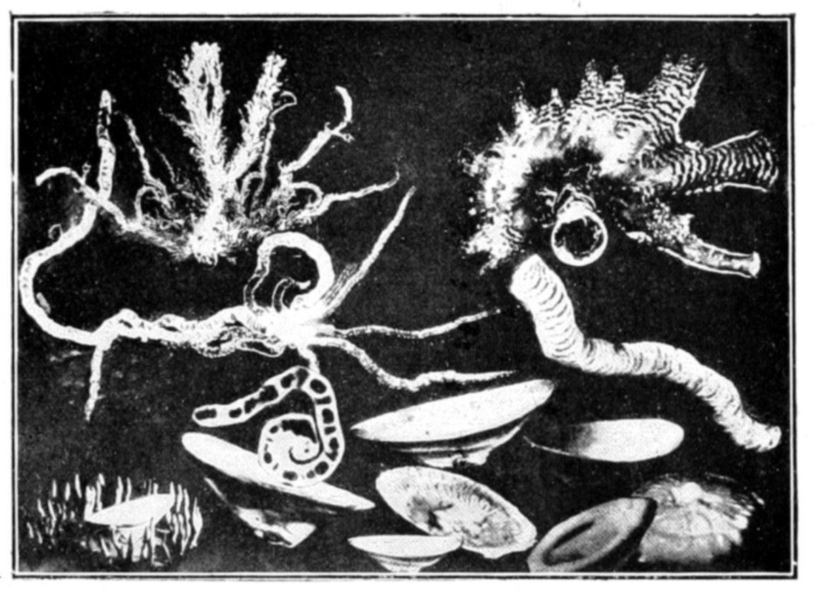 In conclusion we may say that osmotic growths are formed of an ensemble of closed cavities of various forms, containing liquids and separated by osmotic membranes, constituting veritable tissues. This structure offers the closest {144}resemblance to that of living organisms. Is it possible to doubt that the simple conditions which produce an osmotic growth have frequently been realized during the past ages of the earth? What part has osmotic growth played in the evolution of living forms, and what traces of its action may we hope to find to-day? Osmotic growth gives us fibrous silicates, phosphatic nodules, corals, and madrepores; it also gives us formations which remind one of the "atolls," calcareous growths rising like a crown out of the water. The geologist may well consider what rôle osmotic growth may have played in the formation of the various rocks, siliceous, calcareous, barytic, magnesian, the fibrous and nodular rocks and atolls. The palæontologist relies on the different forms found in his rocks to classify his specimens; from the existence of a shell, he concludes the presence of life. Since, however, forms which are apparently organic may be merely the product of osmotic growth, it is evident that he must reconsider his conclusions. The same may be said of the various forms of coral or of fungoid growths. In the {146}presence of a calcified or silicated fungus we can no longer argue with certainty as to the existence of life, without taking into consideration the possibility that the specimen in question may be an osmotic production.