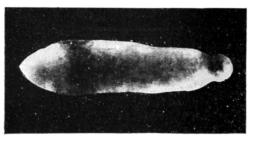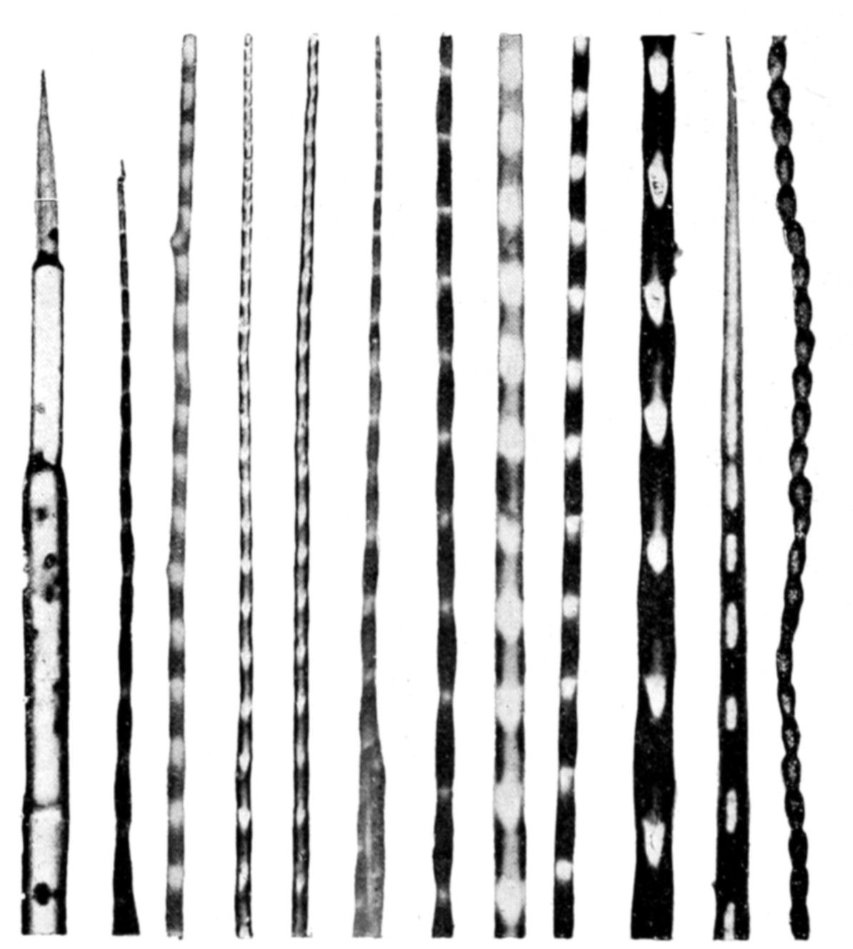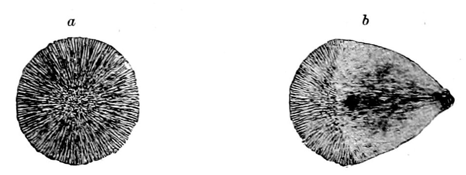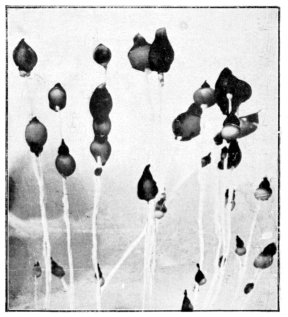 Frequently a single seed or stock will give rise to a whole series of osmotic growths. A vesicle is first produced, and then a contraction appears around the vesicle, and this contraction increases till a portion of the vesicle is cut off and swims away free like an amœba. The same phenomenon may be observed with vermiform growths, a single seed often giving {141}rise in this way to a whole series of amœbiform or vermiform productions.