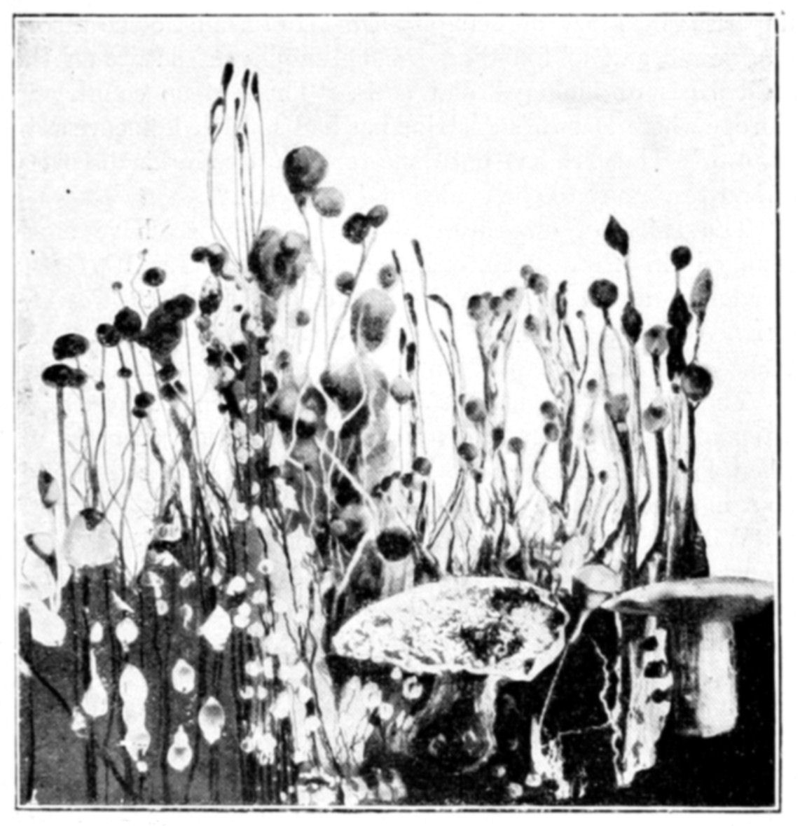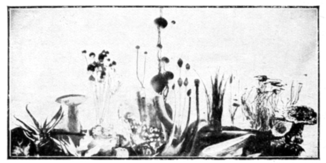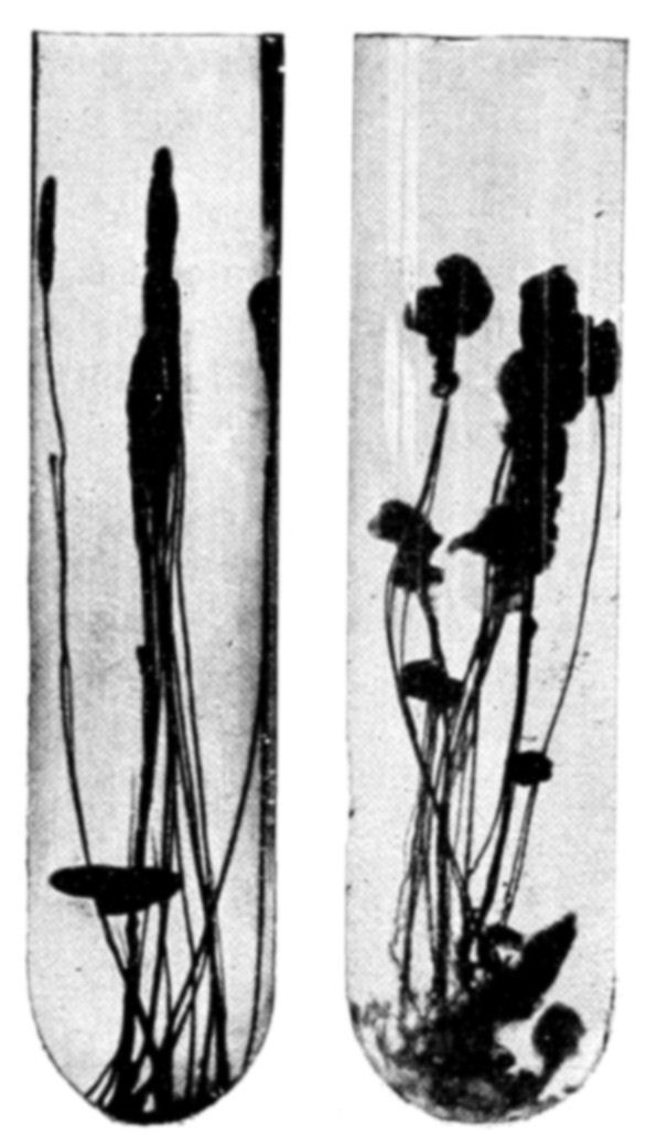 The morphogenic action of diffusion produces osmotic growths of extreme variety. Most of these forms recall those of living things—shells, fungi, corals, and algæ. The analogy of function is quite as close as the resemblance of form. The study of osmosis, however, is as yet in its infancy, and osmotic productions vary with the physical conditions of chemical constitution, temperature, concentration, and the like. The study of the organizing action of osmosis on organic material has as yet been hardly attempted.
