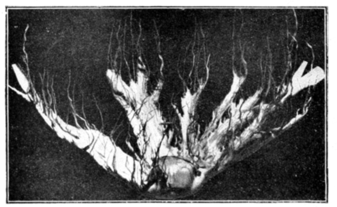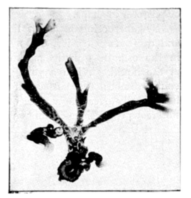 Circulation of the nutrient fluid may also be observed in an osmotic growth as in a living organism. If we take a calcareous growth with long ramified stems and dilute the mother liquor considerably, we may see currents of liquid issuing from the summit of the growth—currents which are made visible by the cloudy precipitates which they cause. The same current is also rendered visible in the stems themselves by the motion of the granulations and gas bubbles in the interior of the osmotic cells. It is plain that some such circulation must exist, for how could a membrane be formed 30 centimetres from the seed if the membranogenous substance did not circulate through the stem? A moment's consideration will show that the propulsion is due to osmotic pressure and not to mere differences of density, for the liquid {152}which rises in the stem is a concentrated solution of calcium salt much denser than the mother liquor, and the current of liquid after rising in the stem may be seen to fall back again through the liquid.