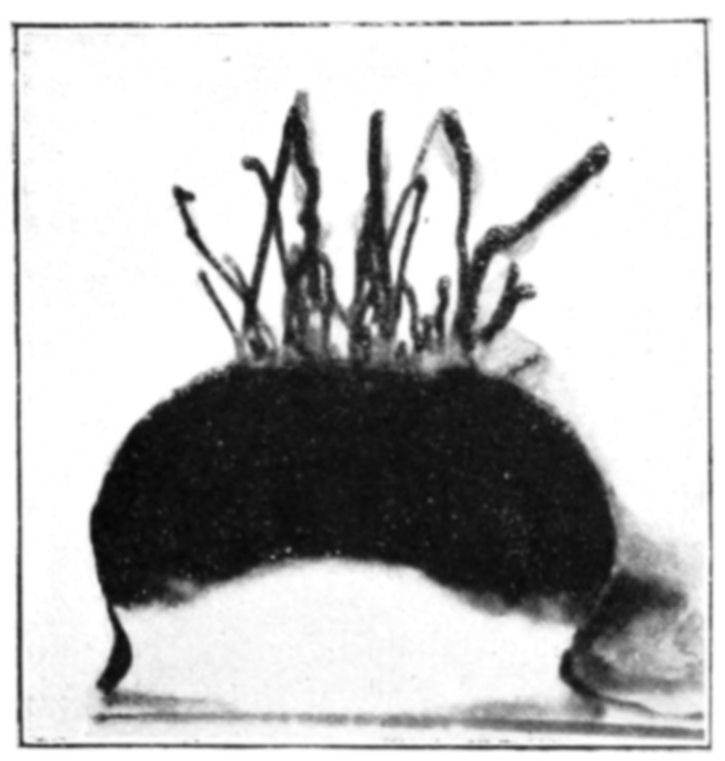 This rhythmic growth may be best observed by sowing in a solution of a tribasic alkaline phosphate, pellets composed of powdered calcium chloride moistened with glycerine, to which has been added 1 per cent. of monobasic calcium phosphate. The experiment is so arranged as to bend or incline the growing stems which shoot out from these grains. This may be done by carefully pouring above the mother liquor a layer of water, or a less concentrated solution. As the internal osmotic pressure rises, the drooping extremity of the twig will become turgescent and gradually lift itself {157}up, and then suddenly fall again for several millimetres. We have frequently watched this rhythmic movement for an hour or more—a slow gradual elevation of the extremity of the twig and a rapid fall recurring every four seconds or so.