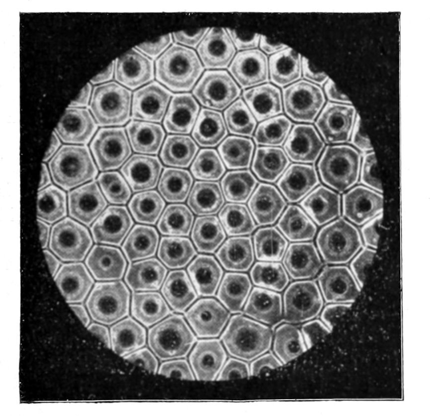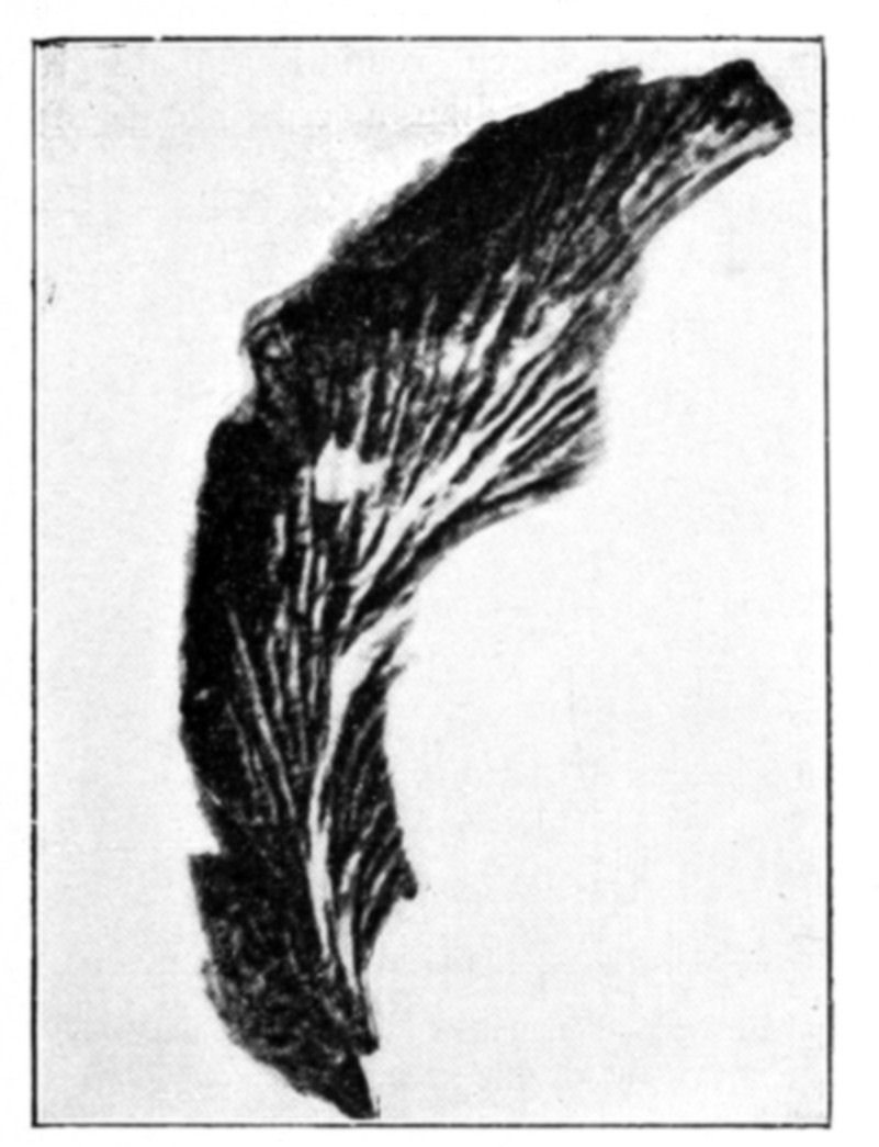 The foliaceous expansions, or osmotic leaves, also present great varieties both of appearance and of structure. The veins may be longitudinal, fan-shaped, or penniform. We have occasionally met with leaves having a lined or ruled surface, giving most beautiful diffraction colours. The usual structure, however, is vesicular or cellular, as in Fig. 58. In photographs we often get the appearance of lacunæ, but all these lacunæ are closed cavities, the appearance being due to the transparency of the cell walls.