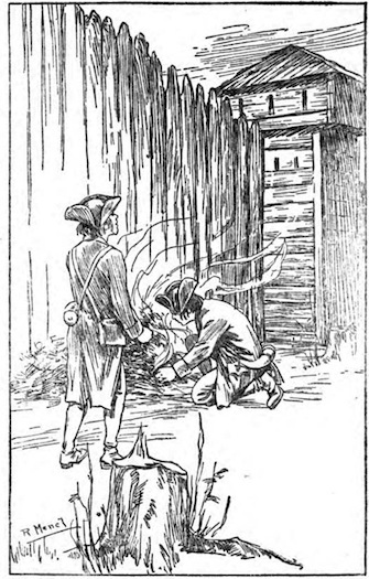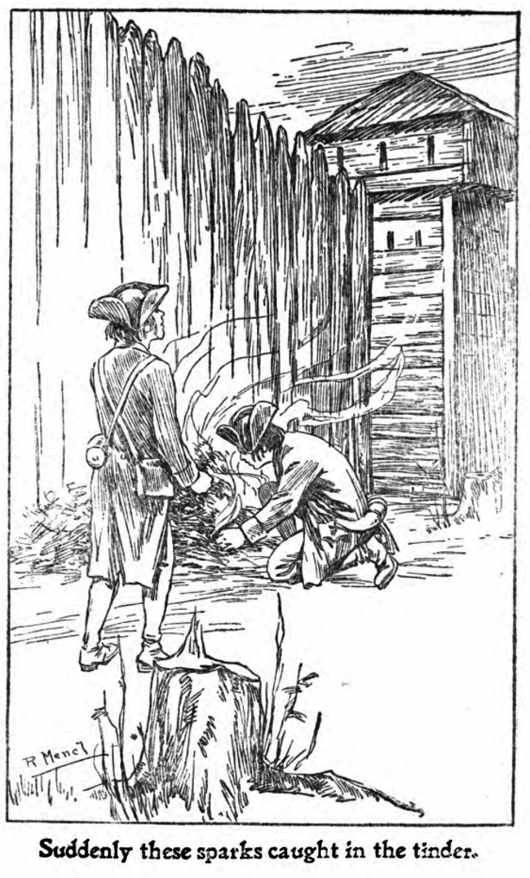 The women and children at the houses had seen what was going on, and had hastened to the fort, carrying such of their household goods as they could manage handily, and they held the gate open for the men to enter. Then, when all were within, the gate was closed quickly, and fastened. The women and younger children entered the building, while the men climbed to a platform that was built along the stockade-wall, on the inside, and perhaps five feet from the top of the wall. From here they could fire over the top of the wall, at the redskins, and then drop down to avoid the arrows of the Indians.