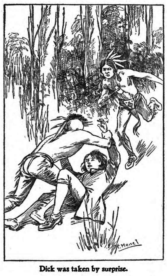 The patriot youths ran rapidly and glancing back over his shoulder, Dick saw that at least one of the redskins was coming after them as fast as he could travel. The brave patriot youth realized that they were going to have a much harder time shaking these Indians off their trail than they usually had with the redcoats. The British soldiers were rather clumsy and slow, but these redskins were lithe as panthers, and as speedy, almost, and could continue running for hours.