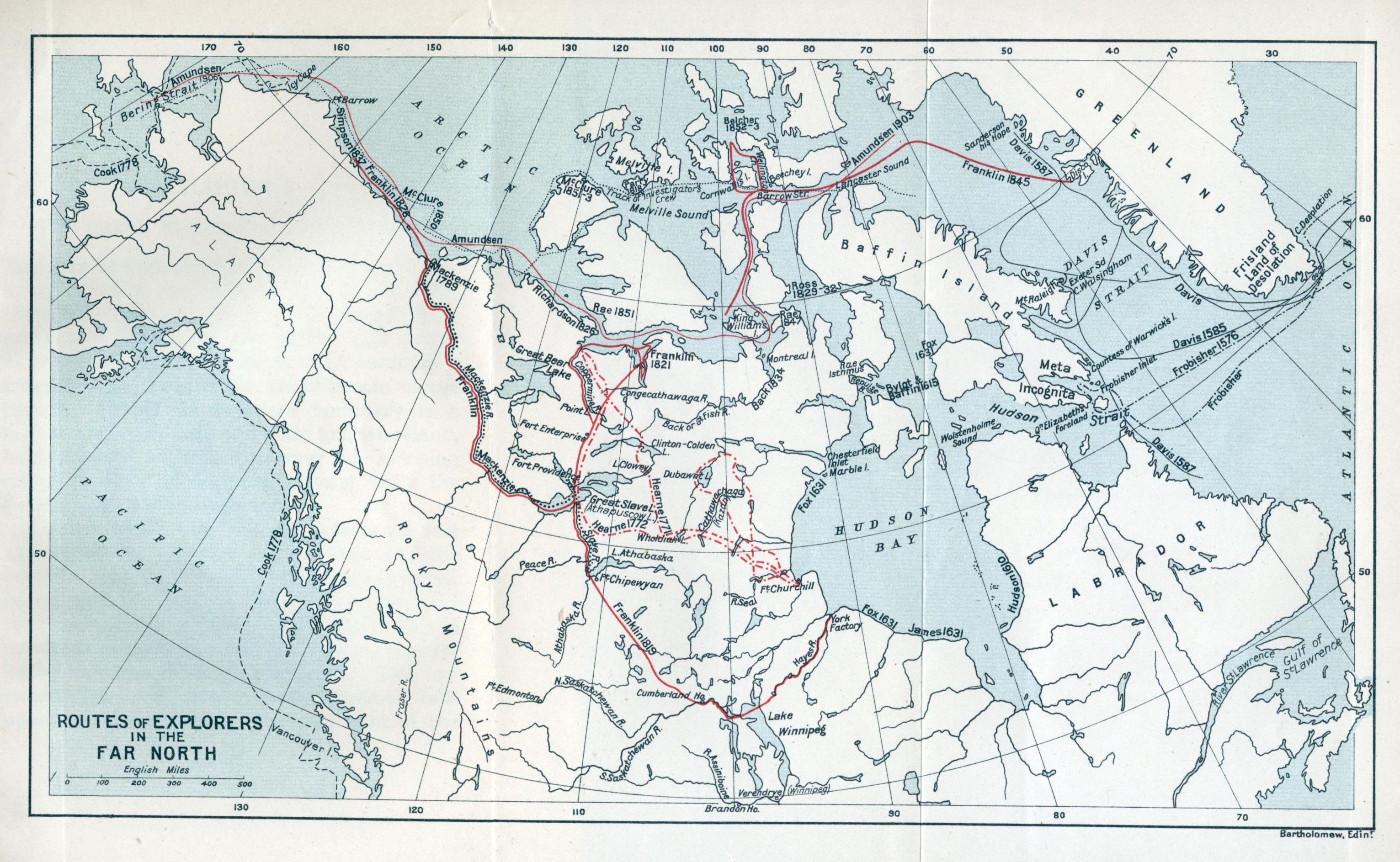 ROUTES OF EXPLORERS IN THE FAR NORTH Map by Bartholomew. |