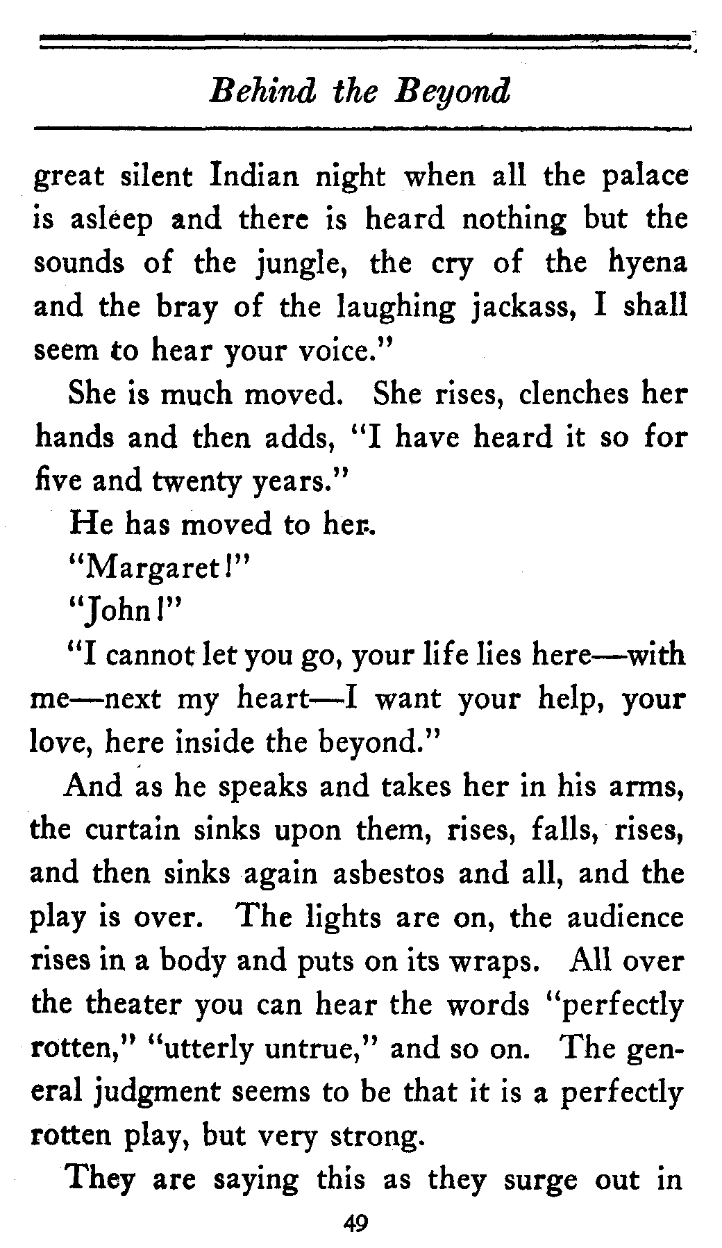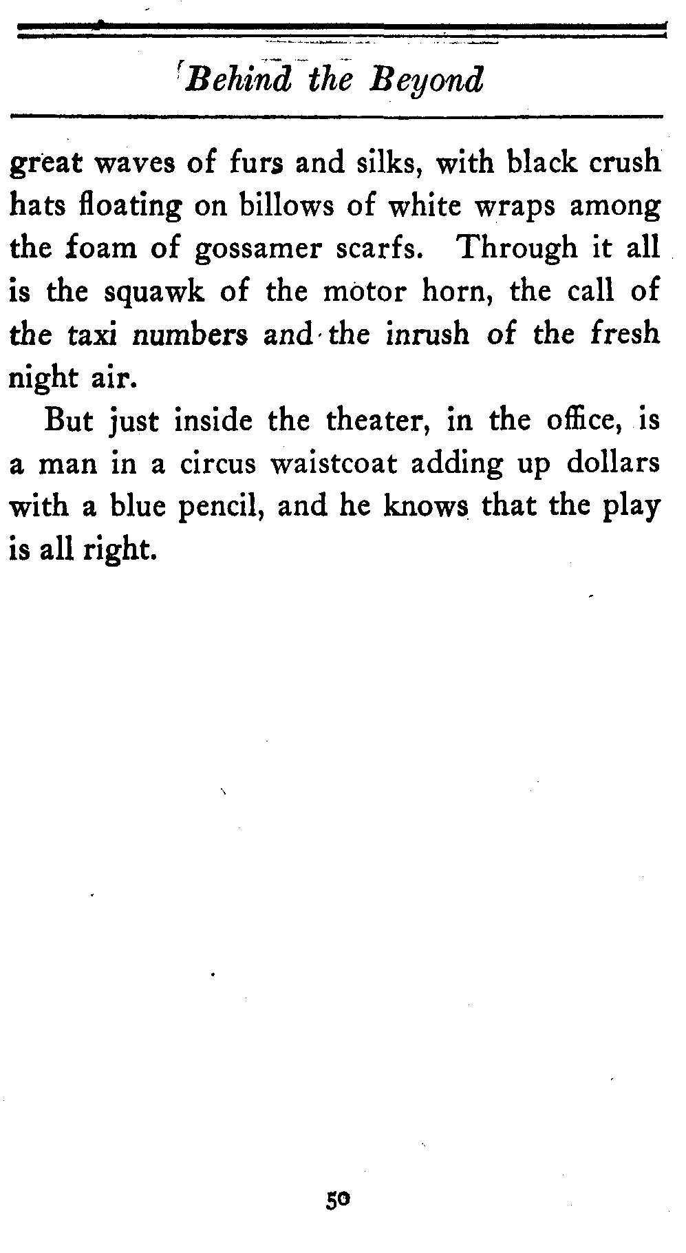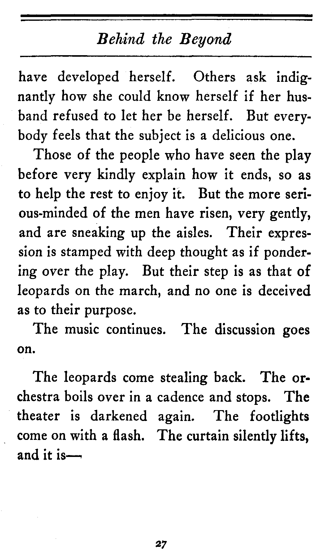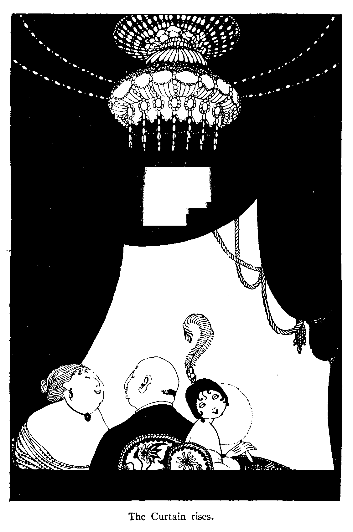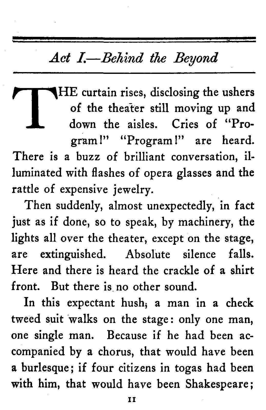 Then suddenly, almost unexpectedly, in fact just as if done, so to speak, by machinery, the lights all over the theater, except on the stage, are extinguished. Absolute silence falls. Here and there is heard the crackle of a shirt front. But there is no other sound.